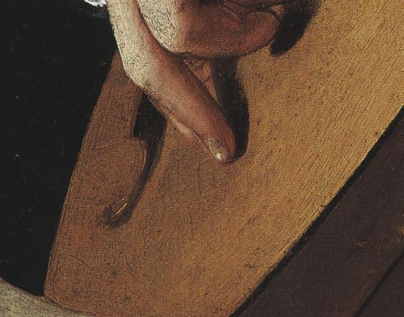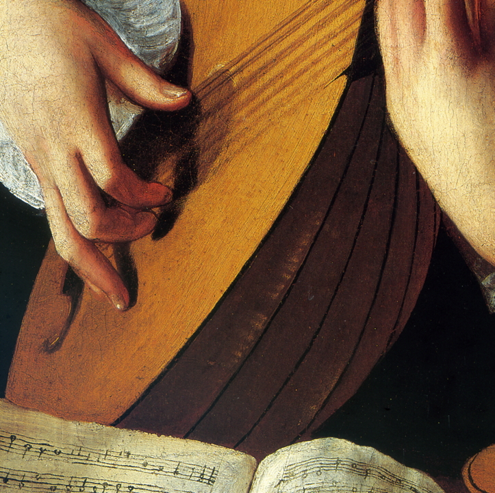 here indeed there is no edging at all (which was perfectly normal for 16th. Century lutes) but look at the beautifully observed worn and shiny edge to the wood of the soundboard, even the grain structure of the wood is clear. Any player of the lute would recognise that appearance, and it confirms Caravaggio as a master of close attention to the texture and structure of things. Even in a picture such as the Musicians the looser brush strokes and freer technique do not conceal the essential clarity of his gaze; where details are suggested they clearly represent actual structures rather than generalised approximations.
