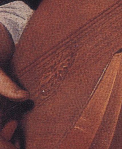 shows that the wider surface is in the same plane as the top of the soundboard, which is the normal form of such an edging, not at right angles to the soundboard, as appears to be the case with the new lute. The painter of this new lute seems to have thought of the ebony edge as a kind of capping strip round the outer edge of the belly; if indeed he has thought at all, for again the overwhelming impression is of lack of close observation of the structure. Compare this quality of observation with the treatment of the edge of the soundboard in the Hermitage lute,