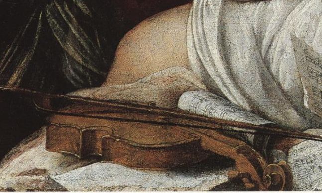 The perspective of the Wildenstein violin in relation to the table is also particularly awkward, the instrument appears lodged into the surface of the table in an almost surreal manner. It makes sense when read with the figure but not when read with the music and the table top.