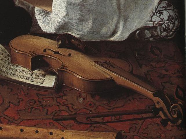 it is wide and coarse to such an extent that it appears out of scale with the instrument as a whole. Wood with grain this wide is rarely used on violins, even very cheap ones. The other major problem with the violin is the arching of the front in the top bout, the top right hand side nearest to the spectator. It slopes down towards the edge in a convex curve which is quite uncharacteristic of normal violins, which usually have a concave section along the line of the purfling before rising toward the rim of the final edge. While one should not dogmatically say that such an arching is impossible for a violin of this period it is so very defining a characteristic of the violin as an acoustic structure that it does cast doubt once again over whether the painter of this picture had an actual violin in front of him at the time. As with the lute, we need only to turn to the Hermitage painting to see a beautiful and fully convincing picture of an early violin with the typical arching one would expect.